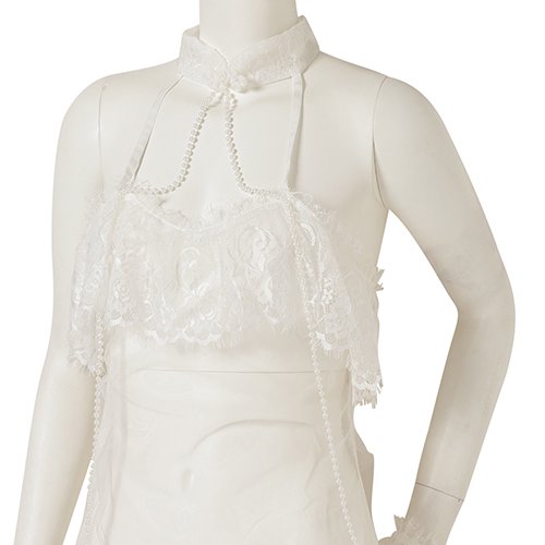 透明感のあるホワイトカラーに煌びやかなレースを施したチャイナドレス風ベビードール(BABYDOLL)。ふわりと包み込むような柔らかな着心地のチュールレース生地のベビードールです。襟元はチャイナボタン風の装飾でアームリングに繋がるパールチェーンはまるでアクセサリーを着けているかのようなドレッシーなデザインに。アイラッシュレースを贅沢に胸元とアームリング、ショーツにあしらい、チュール生地の透け感を生かし素肌とのブラインドを楽しめます。サイドストリングが魅力的なデザインのショーツは、ベビードールに深く入ったスリットから覗きよりセクシーさを高めてくれます。