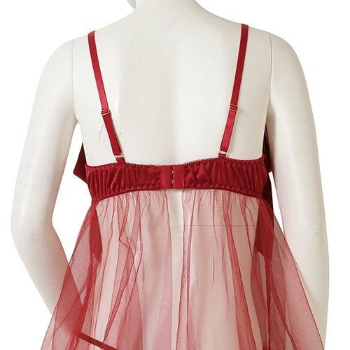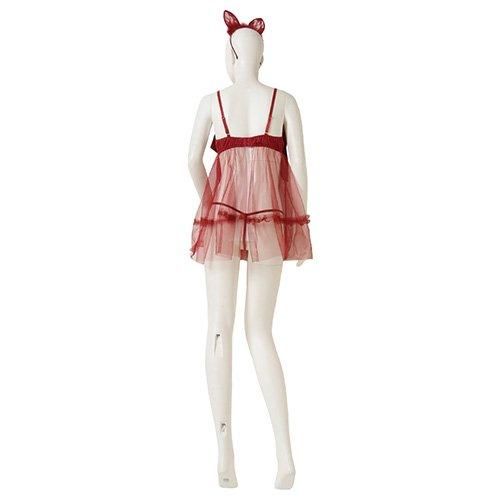 メッシュチュールの透け感とオープンバストに視線集中のベビードール(BABYDOLL)。ワイヤーとサテンリボンでバストを囲い、ふんわりとしたチュール生地を使って仕立てたベビードール。透け感とフレアデザインが大人の魅力を漂わせ、同時に可愛らしさもプラス。レース仕立てのニプレスはバストトップを華やかに飾り、付属の猫耳カチューシャで小悪魔な印象にチェンジも♪アイテムを使っていろんなシーンを楽しんで。背中側のホックは2列3段で調節可能。