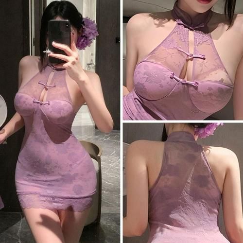 魅惑的な紫の透け感が曲線を魅せつけるチャイナ服風ベビードール(BABYDOLL)。伝統的なチャイナの美しさを残しつつ、鮮やかでありながらも落ち着いたラベンダーパープルの総レース生地が肌を透かし、魅惑的な雰囲気を醸し出す。スタンドカラーに飾りボタンであるチャイナボタンがあしらわれ、袖は大胆にカットされたはホルターネックデザインが肩のラインと背中を美しく見せます。バストにはパットが内蔵され、ボディラインにぴったりと沿いバストからヒップにかけての女性らしいラインを強調。クラシカルな品格とレースの持つ繊細なセクシーさ、そしてミニ丈のモダンさが絶妙に兼ね備えられた華やかで非日常的な一着で夢の中へ誘います。