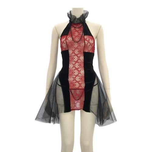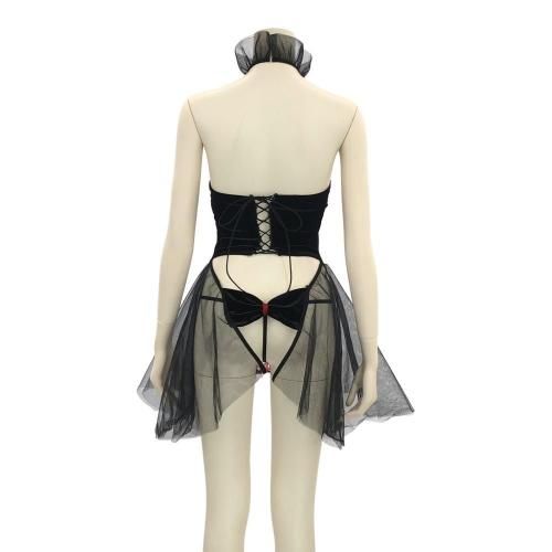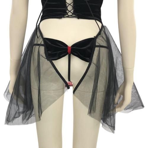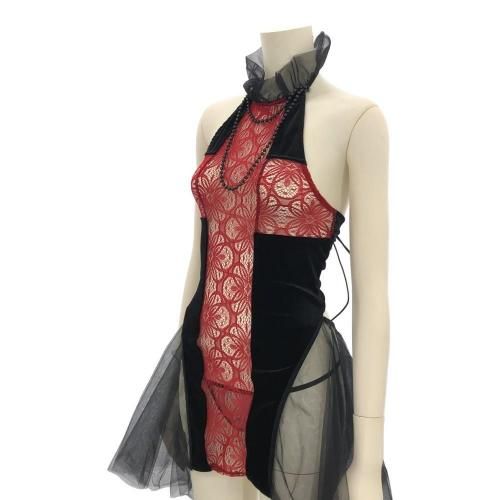 ベールで包まれた真実がミステリアスなシスター風ベビードール(BABYDOLL)。黒いベロアに十字にデザインされた真っ赤なレース、サイドにはボリュームあるチュールをふわりとあしらったフェミニンでミステリアスなベビードール。レースやチュールからは肌が透け、程良いブランディングが魅惑的。首元には、二連の黒いビーズの装飾がゴシック要素を感じます。大きなスリット構造のバックスタイルはリボンを施し、付属のベールを被ることで見え隠れするヒップがとっても挑発的。また身に着けることで、シスターや花嫁のコスプレとしても一気に魅力を放ちます。