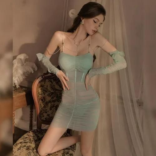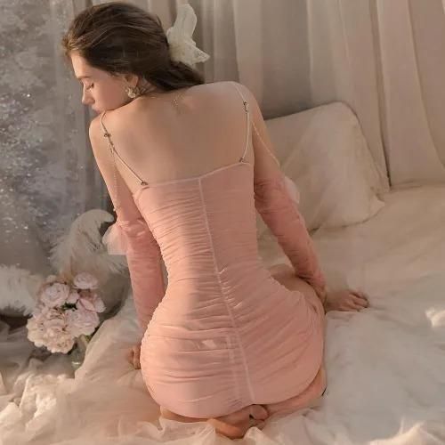 ラグジュアリーとフェミニンが交差するタイトギャザーベビードール(BABYDOLL)。胸パット付きでバストのボリュームをキープしつつ、タイトなボディラインが魅力的。全体的にギャザーを施し、更に引き締め効果と、素肌の陰影が美しいコントラストを生み出します。バスト下のサテンパイピングがウエストをすっきり魅せ、パールビーズのアクセントがラグジュアリー感漂います。また、リボン付きのアームカバーがセクシーの中にもフェミニンを感じるデザインです♪