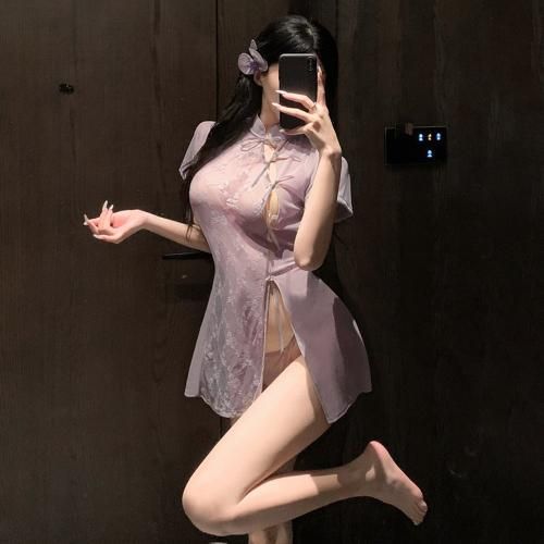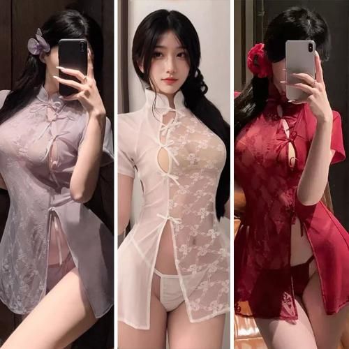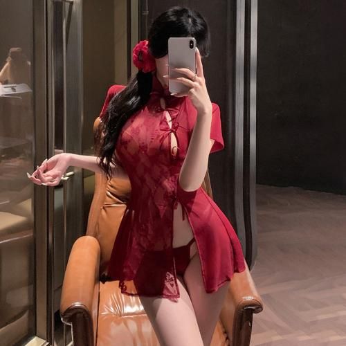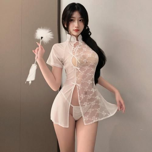 シースルーから覗くボディが興奮を加速させるチャイナ服風ベビードール(BABYDOLL)。素材が異なったレースとチュール2つのシースルーがボディにメリハリを与えてくれる。リボンで結ばれた生地の間から素肌が透け、深いスリットから覗く太ももが更に興奮度を上げてくれます♪背中から腰に掛けて肌が露出し、腰で結んだリボンを解くゾクゾク感が堪らないベビードールです。