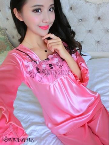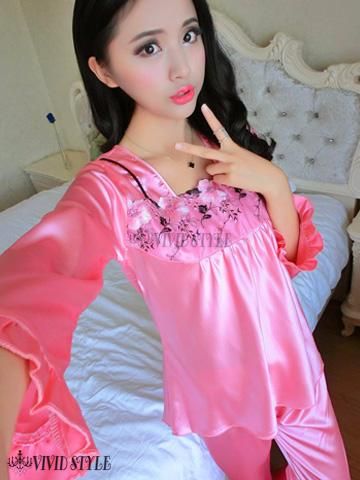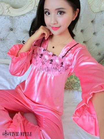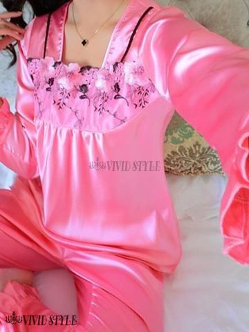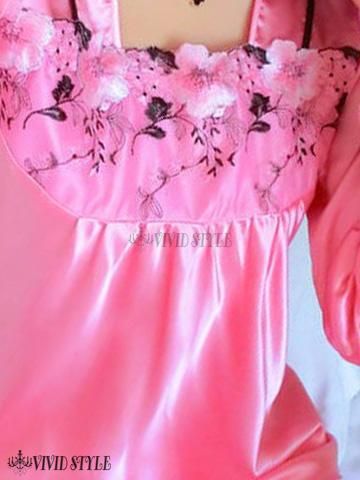 胸元に花柄刺繍入りのメッシュ生地を合わせたエレガントなデザインのパジャマ(PAJAMAS)。袖口とパンツの裾に共布のフリルをあしらい、大人っぽさと可愛らしさを併せ持ったデザインとなっています。素材はポリエステルサテン、柔らかいメッシュ生地を使用。
