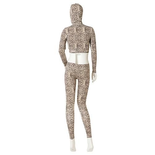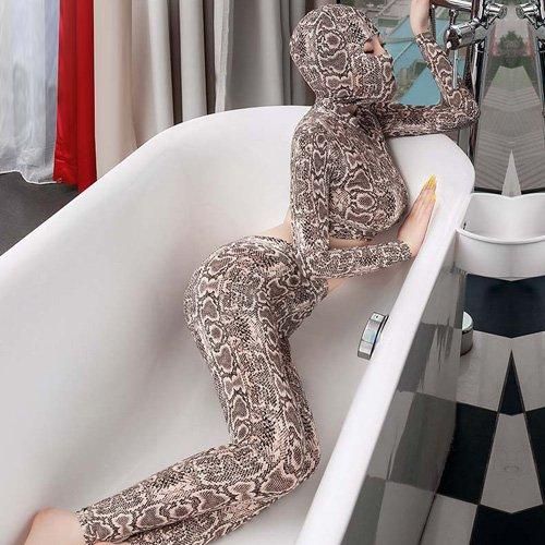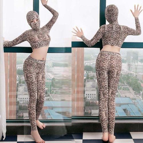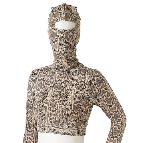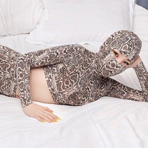 パイソン柄がスパイシーな印象を与え一味違うセクシーさを追求出来るセットアップタイプのボディスーツ(BODYSUIT)。大人なパイソン柄のボディスーツはクールな印象を与えながらもオシャレさが際立ちます。ボディスーツにしてはかなり珍しいデザインがGOOD♪短めトップスはウエストをオープンにし解放感を。ボディラインをよりセクシーに見せヒップからクロッチにかけて開閉できるファスナー付きのパンツにフェイスマスクを装着すれば、全身タイツフェチの方にもたまらない、非日常を堪能できる究極のエロスを演出できます。
