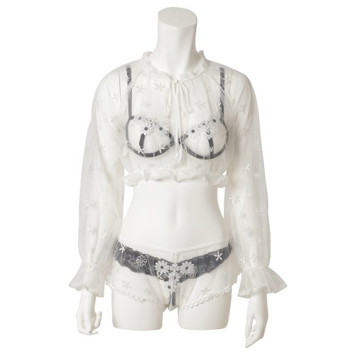 花の刺繍モチーフがガーリーなブラ・ショーツセット(BRA・SHORTS SET)。刺繍の入ったチュール素材のトップスとショートパンツや、ブラとショーツに付いたフラワーモチーフがガーリー&キュートなデザイン。トップスは襟元の紐を縛りハイネックにしたり、オフショルでセクシーにと2wayの着こなしを楽しめます♪肩紐はアジャスター付き、ブラホックは2個留め3段階調節可能。