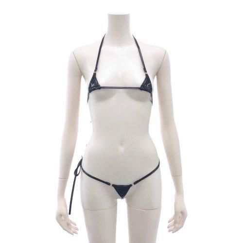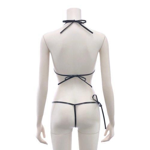 ストリングが官能的なマイクロブラ・ショーツセット(BRA・SHORTS SET)。極小マイクロブラがインパクト大の紐ビキニタイプのブラセット。PUレザーの光沢と質感がクールなストリングデザインで、それぞれリボンで結んだだけのシンプルな作りがより一層官能的に仕上がりました。バストトップとアンダーが見えるか見えないかのギリギリを攻めた極小デザインでサドにもマゾにもどちらの性質にも合わせられるビジュアルです。セットにはボンデージイメージにマッチした太めのベルトデザインのシームドストッキングを合わせて脚先まで隙のない見た目に仕上げました。
