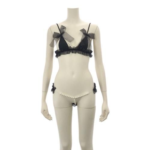 パールとチュールの甘い誘惑に酔いしれるブラ・ショーツセット(BRA・SHORTS SET)。センターにパールビーズを施した大胆なセット。チュールリボンとフリルのエアリー感が乙女心をくすぐりつつ、セクシーなデザインがいつもよりちょっと大胆な気分にさせてくれる♪セクシーな見た目だけではなくクロッチ部分を刺激し、布面積が小さなブラの甘い誘惑にドキドキが止まらない!2列3段のホック付きで調整可能です。