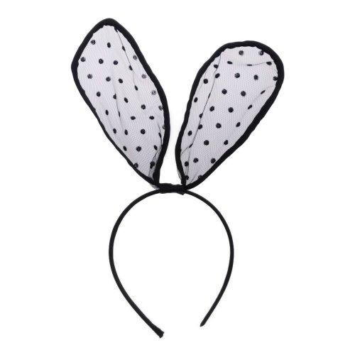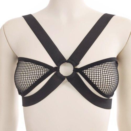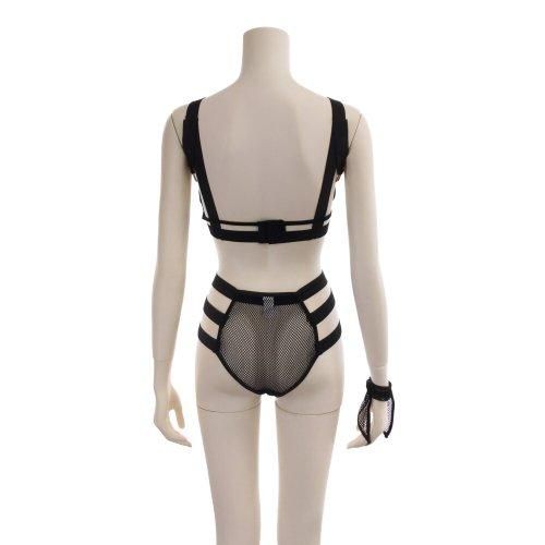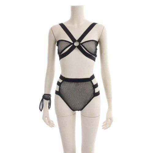 太めのストリングと網目の大きいメッシュ生地がボンデージ感を漂わせるブラ・ショーツセット(BRA・SHORTS SET)。着用すると網目がより広がるメッシュ生地と存在感のあるストリングで構成された大胆デザインのブラ・ショーツ。クロスさせたバストのストリングと腰回りのストリングでボディラインを強調し、伸縮性のあるメッシュ生地で透け感を演出。ストリングは太さのある柔らかい生地で仕上げているので嫌な窮屈感を軽減しご着用頂けます。メッシュ生地のアイマスクとドット柄のチュール生地で仕立てたうさ耳のカチューシャがセットになっており合わせればハードさの中にも少し可愛らしさも感じさせるアイテムです。ブラの背中には3列3段のホックがついています。