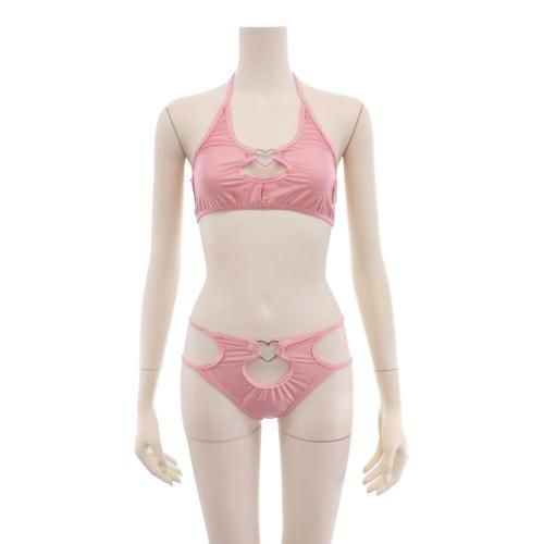 ストリング使いでセクシーな肌魅せ効果抜群のブラ・ショーツセット(BRA・SHORTS SET)。光沢感のある素材で艶やかな色気を発するブラセット。ブラとショーツのフロントにはハート形のリングがあしらわれ、可愛い印象に。生地の伸縮性が高いので肌にぴったりと馴染みカッティングされた部分はヘルシーな印象を与えます。ブラはホルターネックデザインに背中のワンホックで着脱も簡単です。ショーツにもフロントカットが入り色気とスタイリッシュな雰囲気を持ち合わせたアイテムです。