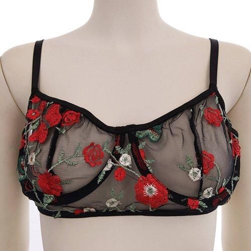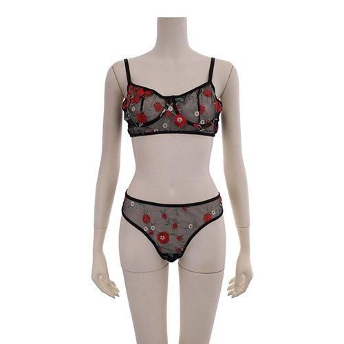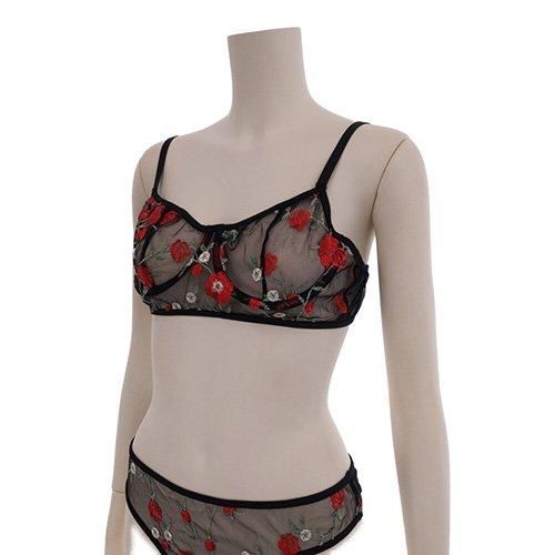 フラワー刺繍が咲き誇り気品あふれるブラ・ショーツセット(BRA・SHORTS SET)。ブラックのチュールレースに施された薔薇の刺繍が素肌に映えるセクシーデザインのランジェリーです。その透け感と大人っぽい配色で服を脱いだ瞬間ハッとさせるインパクトも♪ブラはワイヤー入りで、ホックは2列3段階調節が可能。ショーツにはコットンの裏打ちが付いています。