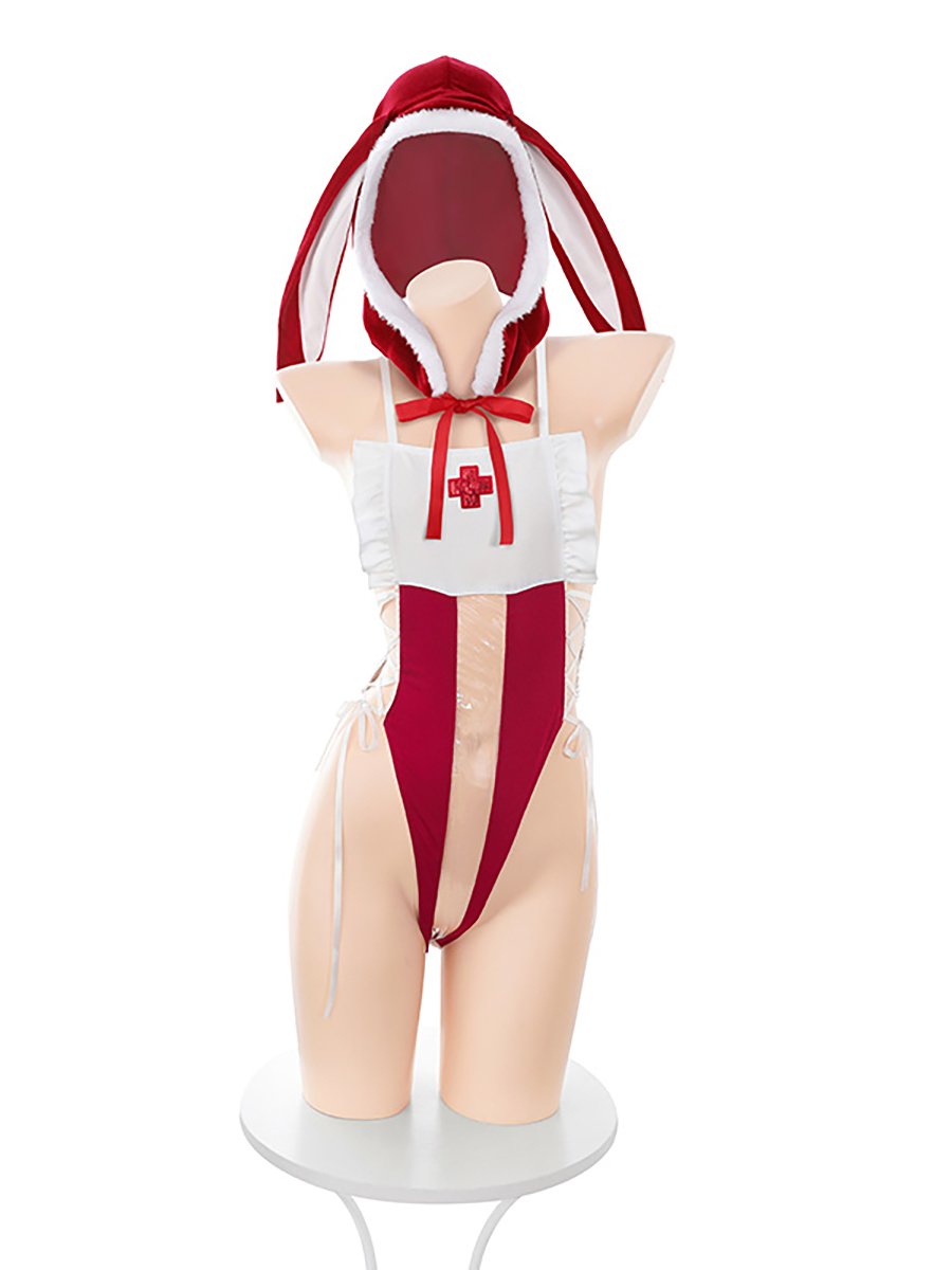 デザイン:赤いベルベット ウサギの耳の帽子が付いたボディスーツがコスプレセットの可愛さをプラスします。 サイドのレースアップデザイン、フックとアイクロージャー付きのオープンクロッチが、神秘的で魅力的な雰囲気を醸し出します。 恋人の注目を集めやすくなります。