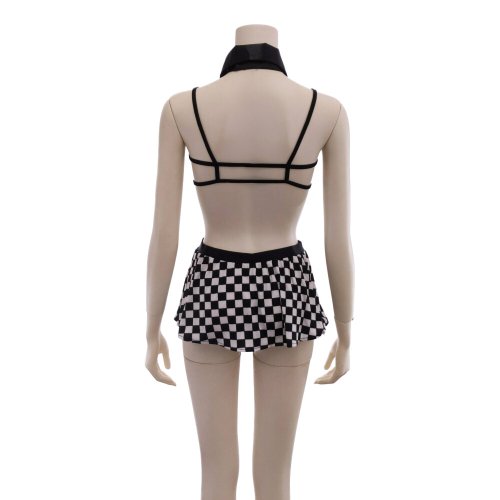 レーシーで疾走感あふれるレースクイーン風セクシーコスプレ(SEXYCOSPLAY)。黒白のチェッカーフラッグモチーフの眼帯ビキニトップスとミニスカートがセットになったレースクイーン風コス。バストトップのみを隠した面積極小のトップスはアンダーバストが覗き見える仕様。平らなストリングと組み合わせた仕立てで着心地もストレスフリーに♪スカートはふわっと広がるフレアマイクロミニ丈で健康的な可愛さも忘れません。小物もセットになっているので1着でRQトータルコーディネートが楽しめます♪