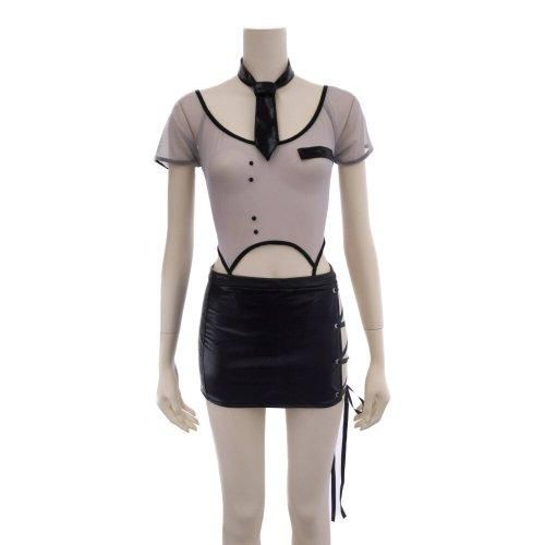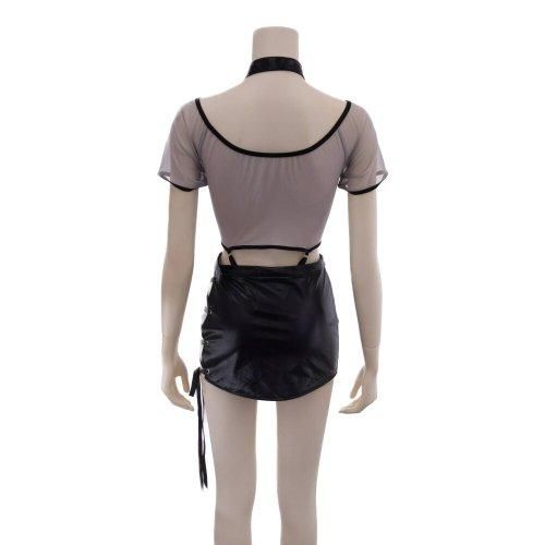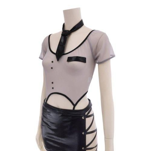 メッシュとレザーの異素材コンビが斬新な婦人警官風コスプレ(COSPLAY)。透け感の強いソフトメッシュのトップス風のテディとフェイクレザーのスカートがハードな印象を与える婦人警官風のコスプレです。デコルテまで大きくカットされた首回りにはフェイクレザーのネクタイが映え、ミニスカートはサイドがレースアップで太ももを露にさせハードな印象に。ミニ丈感がヒップラインを意識させます。スカートはマジックテープがついており着脱が簡単なのもポイントです♪テディにもアジャスターが付いており着丈の調節か可能。