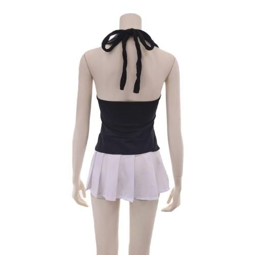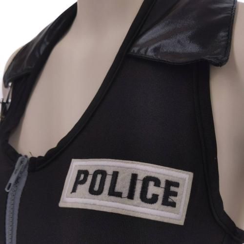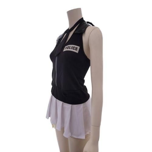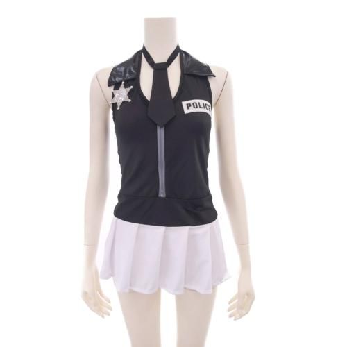 ミニスカのポリス風コスプレ(COSPLAY)。ホルターネックのワンピースはスカートを極限まで丈を短くしてセクシーなデザインに仕上げました。スカートから伸びる太ももや大きく開いた背中などセクシーポイントも満載。手錠や帽子のアイテムを使って雰囲気アップするのもオススメです。