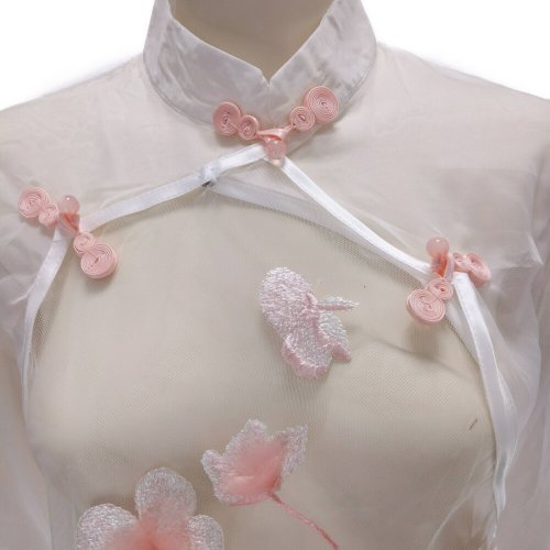 素肌をより美しく魅せるチャイナ服風セクシーコスプレ(SEXYCOSPLAY)。チュールレースにお花の刺繍を施し、襟やボタンなどチャイナ服風にアレンジしたコスチューム。前あきのトップスはさらっと羽織るだけでも雰囲気たっぷり。透ける素材から女性本来の素肌感を十分に楽しめます。光沢感のあるスカートはラップタイプでマジックテープ止めなのでサイズ調節可能です。