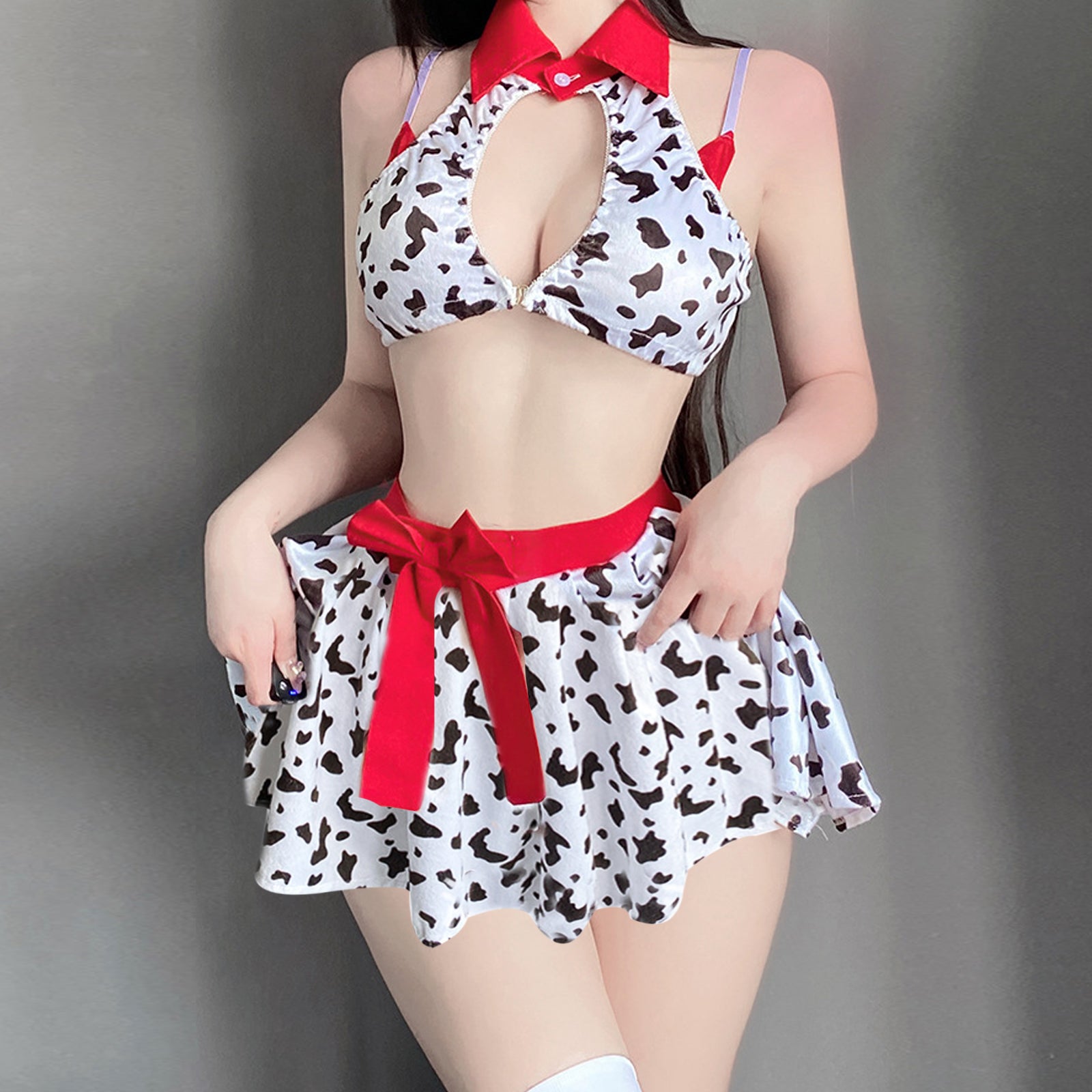 デザイン: セクシーな牛のコスプレ衣装は、調節可能なショルダーストラップ付きのホルタートップ、襟付きネックライン、ボタン1つデザイン、フックフロント留め、ベルクロ留めのマッチするミニスカートが特徴です。オープンバックパネルとリボンのアクセントで、遊び心のあるタッチを加え、きっと気に入っていただけます。
