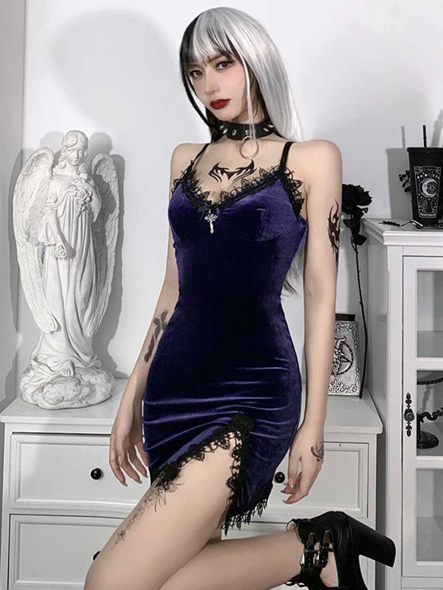 デザイン:ベルベットゴシックスタイルのコスチュームは、黒のミニドレス、調節可能なスパゲッティストラップ、メタルクロスペンダントのアクセント、黒のレースのトリムが付いたフィットしたボディス、サイドスリットの裾が特徴です。これはあなたをより魅力的に見せるためにデザインされたキュートでセクシーなコスチュームです。