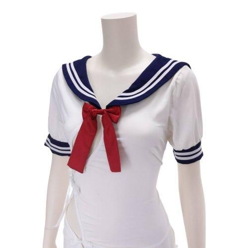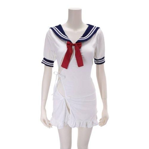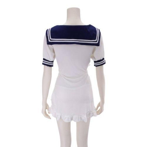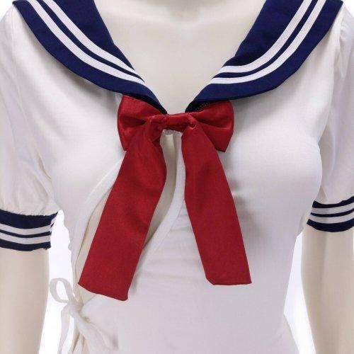 チャイナドレスチックなセーラー学生服風コスプレ(COSPLAY)。セーラーにフリルがキュートでありながら、大切なところはチャイナボタンとリボンで結んだだけのザインなのであっという間に恥ずかしい姿に。シンプルなバックスタイルを裏切るセクシーなフロントデザインにパートナーも釘付け。