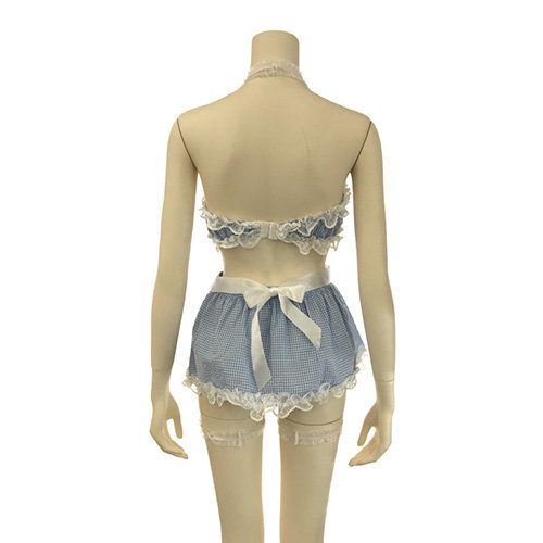 ギンガムチェックの爽やかな印象に露出度高めが色気を放つキュートなウエイトレス服風セクシーコスプレ(SEXYCOSPLAY)。チューブトップ型のブラには女の子らしく華やかなギンガムチェック柄にレースと花の刺繍、リボンの編み上げを仕立て、可愛さの中にも色気を放つデザインに。絶妙な丈感のミニスカートからチラリと見え隠れするヒップにもパートナーの視線が集中すること間違いなし♪チューブトップブラは2段3列のホック付きでサイズ調節可能。スカートのゴム部分には平ゴムを使用し着苦しさを軽減してくれます。