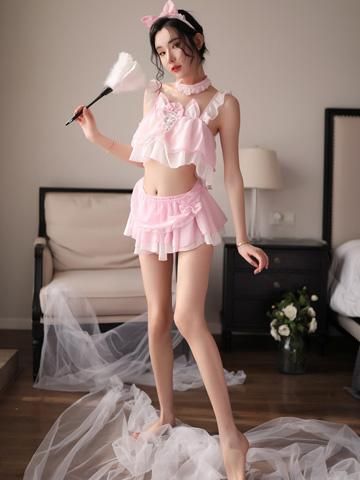 可愛い猫ちゃんが甘く癒してくれる猫耳メイド服風コスプレ(COSPLAY)。柔らかなシフォン素材をレイヤードさせてさらにふんわり感を出した愛らしいセットアップは、トップスの胸元には猫耳が付きスカートのエプロンにはキュートなリボンと可愛さを集めた無敵の色気のある可愛いデザインです。ネコ耳やチョーカーなど付属品もとにかく可愛らしさにこだわったアイテムで、こんなキュートなメイドさんにご奉仕されたらパートナーもメロメロになること間違いナシ♪