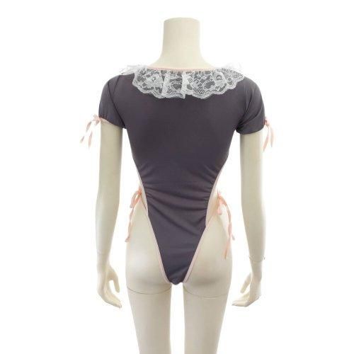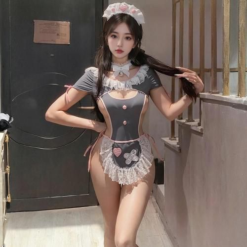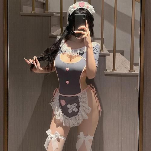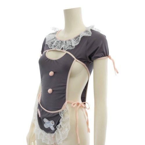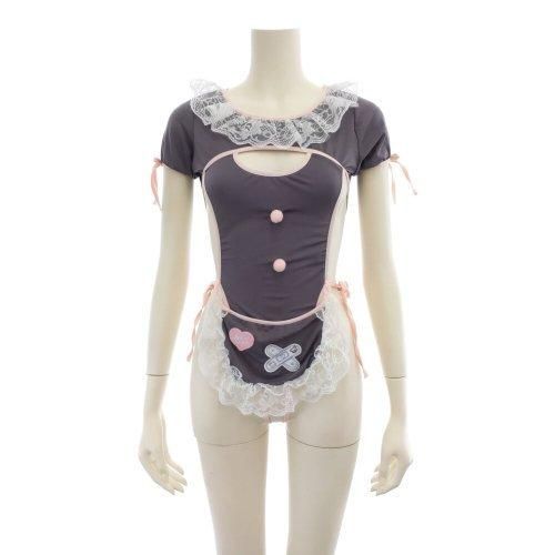 胸元のカットアウトからこぼれそうなバストが刺激的なメイド風コスプレ(COSPLAY)。お袖のリボンや首元のフリルなどふんわりとした印象が愛らしさ満点のキュートなコスチュームです。カットアウトされたバストと、クロッチからヒップにかけてストリングのみでオープンとなった大胆な仕立ては素肌を惜しげもなく魅せる露出感がたまらなくセクシーで、紐を解くとはだけてしまう危うさが高揚感を煽ります。