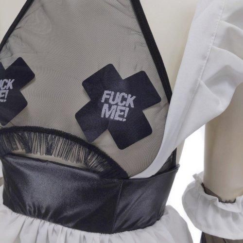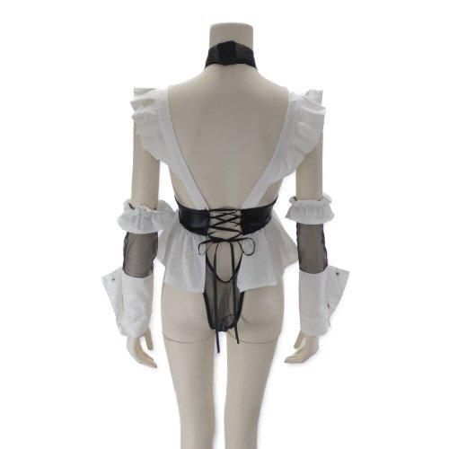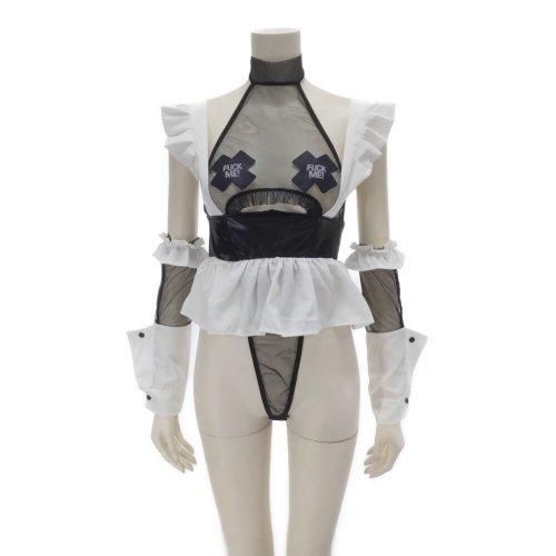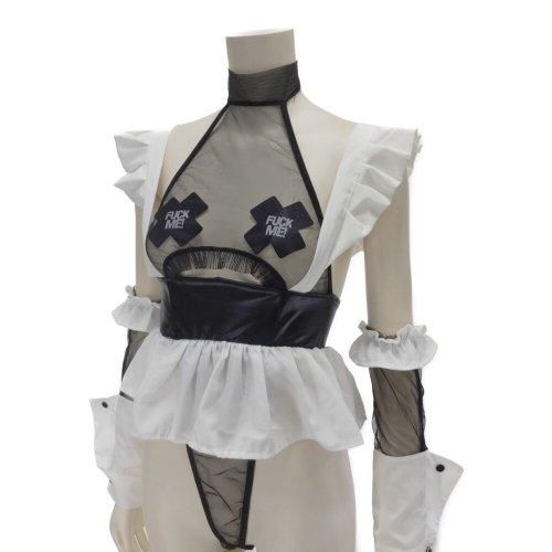 ちょっとゴシックで挑発的!超個性派メイド風コスプレ(COSPLAY)。一見奇抜に見えるコスチュームですが、フリルやメッシュ、レザー調の素材など異素材を巧みに使いディテールにこだわったアイテムです。パーツは主張が強いですが全体的に見るとキュートな印象に見えるのが不思議です。さらにホック付きの解放的なクロッチ仕立てでセクシーさもバッチリ完備♪