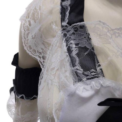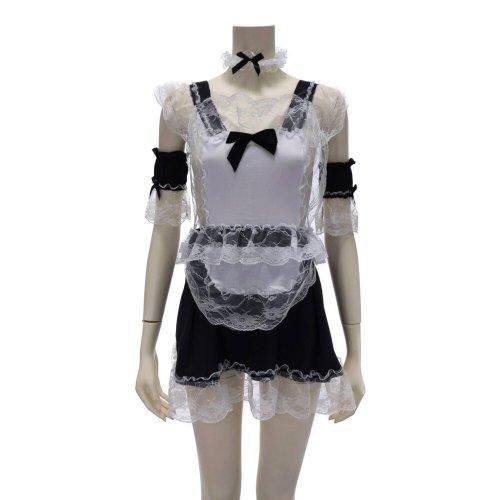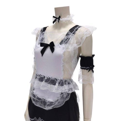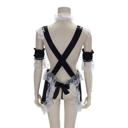 アイテム充実のメイドエプロン風コスプレ(COSPLAY)。ブラックベースにホワイトレースをたっぷりあしらい大人可愛い雰囲気をプラス。光沢のあるサテン風生地が本物感溢れます。エプロン風ミニ丈ワンピースのバックスタイルはヒップが露出されることでパートナーの視線が集中。レース越しに透けた胸元もセクシーです♪同生地のTバックショーツ、カチューシャ、アームリングなど充実したセット内容になっています。