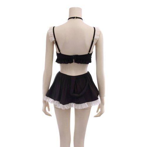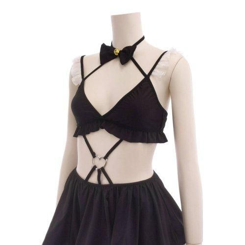 仔猫のような可愛さに誘惑されてしまう猫メイド風コスプレ(COSPLAY)。首元からブラ、スカートまで一体となったワンピースにはレースやフリルを施して可憐さを全面でアピール♪ブラジャーとエプロン風ミニスカートはハートモチーフのリングを中心にストリングで一体化しているのでビキニのような見た目と露出度の高さにも注目です。鈴付きの首輪をイメージしたチョーカー部分や猫耳付きカチューシャに付け尻尾など猫なりきり小物も充実!メイドさんらしいニーハイもセットにしてお届け♪