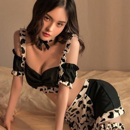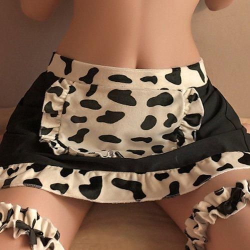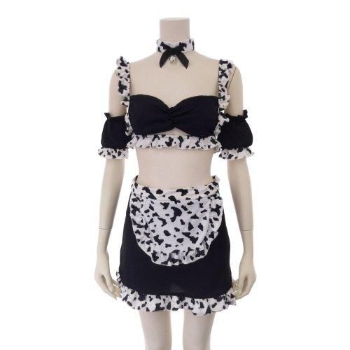 コケティッシュなモウ柄メイドさん風コスプレ(COSPLAY)。メイド服の印象を覆す「ホルスタイン×メイド」の斬新デザイン。モウ柄エプロンがアクセントのスカートと、同じくモウ柄フリルを施したキュートなメイドさん風コスチュームができました。ブラは伸縮性があるストリングにZ管のホック付きで、肩紐はアジャスター調節可能。スカートはマジックテープで止めるラップタイプで着脱が楽ちんです。スカートの合わせ部分からはヒップが覗き興奮を誘う仕立てにドキドキが止まりません♪