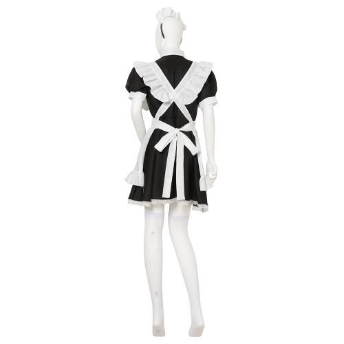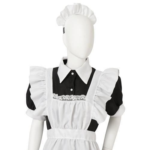 リアル感の高いモノトーンのメイドさん風コスプレ(COSPLAY)。正統派カラー白黒のワンピースと取り外しできるエプロンのコスチュームセット。しっかりめの生地で仕立てたミディ丈のワンピースの裾にはフリルレースがあしらわれてキュート。エプロンはシンプルに見えてフリルをたっぷりあしらったキュートなデザインです。付属のストッキングとカチューシャで、コスプレ初心者さんも抵抗なく完璧なメイドさんに変身できちゃいます。