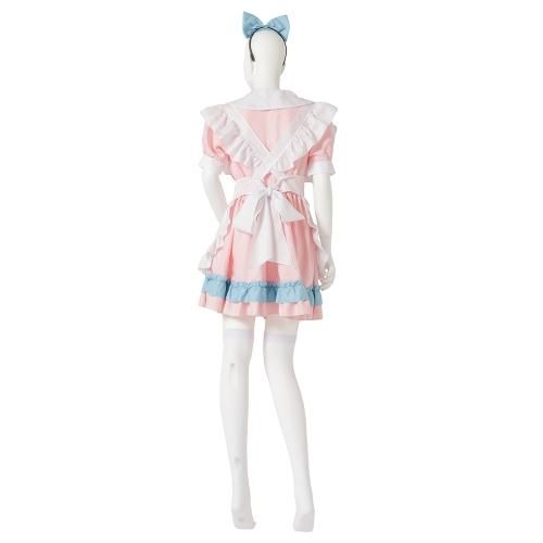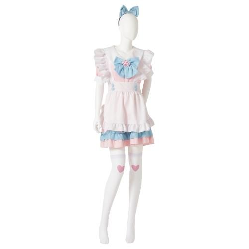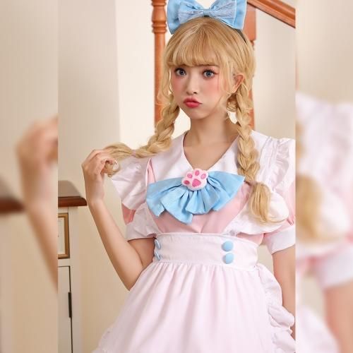アニマルキャラのアイテムがキュートなメイドさん風コスプレ(COSPLAY)。ファンシーカラーのワンピースと取り外しできるエプロンでキュートなメイドさんに変身。ミディ丈のフリルワンピースは襟付きで可愛い中に正統派な印象もプラス。シンプルに見えてデザインにこだわった1着です。付属のストッキングとアニマルモチーフのカチューシャなどで完璧なメイドさんに変身してみて。