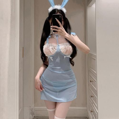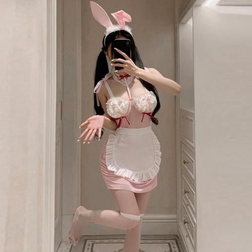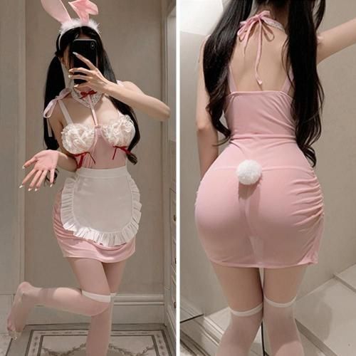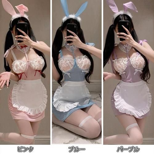 バニーの純粋な可愛らしさの中に潜む挑発的で大胆な魅力が融合したメイド風コスプレ(COSPLAY)。淡い色合いに白いレースやフリルが肌に優しく溶け込み、柔らかさを感じるバニーガールと融合した新感覚メイドコスプレ。シースルーのタイトミニワンピはワイヤーカップがバストを持ち上げ、美しいデコルテラインを演出。花柄の繊細なシースルーレースが優しくバスト全体を包み込み、肩で結ぶショルダーストラップを解くと肌がはだけ、想像だけでワクワクしてしまうセクシーでフェミニンなデザイン。ワンピにフリルのエプロンを身に着けることで一気にメイドに早変わり♪腰には取り外し可能なふわふわの尻尾付きで、バックスタイルからもパートナーを魅了します。