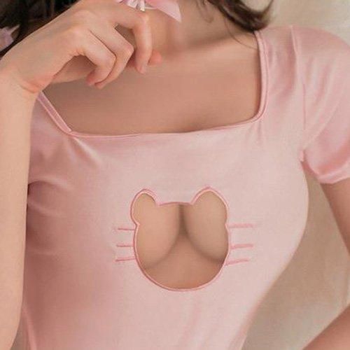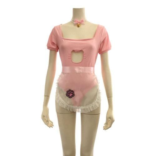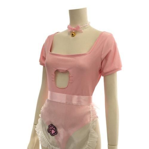 アニマルモチーフのカットアウトから魅惑的なバストがのぞくメイド風コスプレ(COSPLAY)。フロント、エプロン、アクセサリーとあらゆるところに『ネコ』のモチーフを使い、抱きしめたくなるようなラブリーなネコミミメイドコスに仕上げました。伸縮性の高いテディはしなやかな手触りでボディを優しく包みこみボディラインを露わにしながらセクシーなフォルムを再現します。クロッチは2列3段階のホックによる開閉で着脱も楽ちん。エプロンはオーガンジー生地とレースをあしらい透け感秀逸でテディのハイレグカットを望む視界を邪魔することなくビジュアル的にも楽しめちゃいます。セットの猫耳カチューシャをつけたらチョーカーに連なる鈴の音色にあわせて愛嬌たっぷりな子猫ちゃんのように甘えちゃいましょう♪