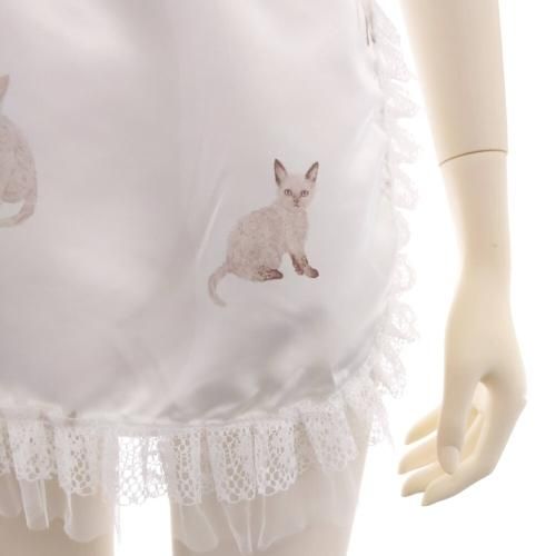 胸元とヒップの開きが目を惹くキュートな猫柄がポイントのメイドさん風コスプレ(COSPLAY)。猫の柄が珍しいサテン生地を使用し猫耳付きのカチューシャがセットになったメイドさん風のアイテムです。胸元をオープンにしたブラウスはレースやフリルを施して可愛く仕立てました。エプロン風のワンピースはバスト部分がハートモチーフのメッシュで透け感たっぷり。ウエストは紐で縛るのでサイズ調整が容易に可能。バックスタイルは素肌の露出が高く自然な丸みのあるヒップラインを曝け出します。