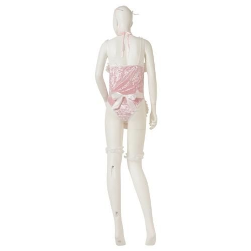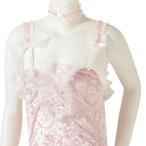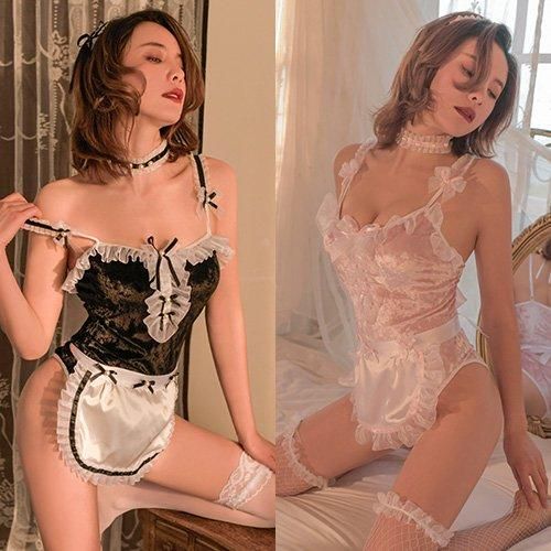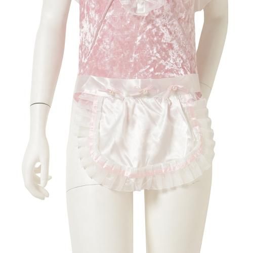 可愛いアイテムいっぱいのメイドさん風コスプレ(COSPLAY)。ベロアのやわらかい肌触りに思わず触れたくなるメイドさん風のコスチューム。ギャザータイプのチュールレース、サテンリボン、パールビジューなどがふんだんにあしらわれてときめきが止まりません。クロッチ部分はホックが2列3段で開閉できてドキドキ感も♪エプロンは取り外し可能で、カチューシャやニーハイストッキングを着用をすれば全身キュートな雰囲気に。