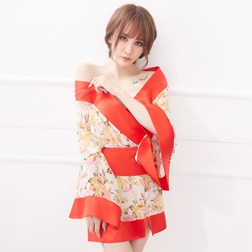 淡いシフォンにフェミニンフラワーが咲く浴衣風セクシーコスプレ(SEXYCOSPLAY)。柔らかな透け感のシフォン生地にフェミニンな花柄を描き、差し色のレッドが全体を引き締めながらより華やかに魅せるデザイン。リボン帯にも花柄があしらわれ、後ろ姿までキュート♪
