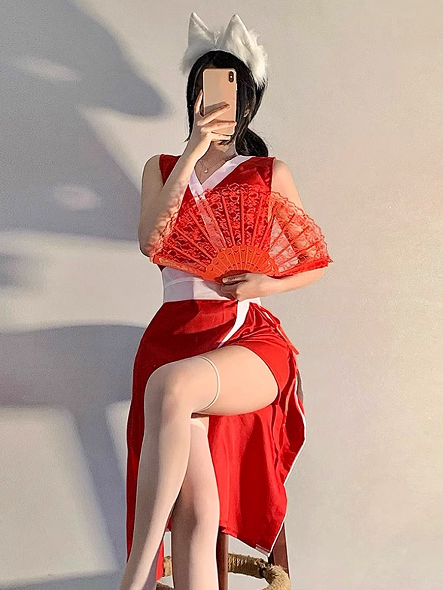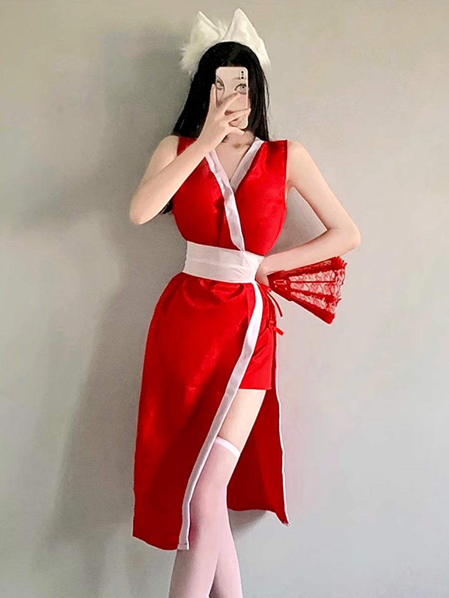 袖丈: ノースリーブデザイン:セクシーなアニメコスプレランジェリー 。白い幅広のトリムが付いた赤い忍者スタイルのドレス、フロントのドレープ生地パネル、ストリングウエストベルトが特徴で、快適なままあなたの曲線と体型を披露します。ハイスリットの裾は、蒸し暑い夜にぴったりで、お揃いのショーツも付いています。