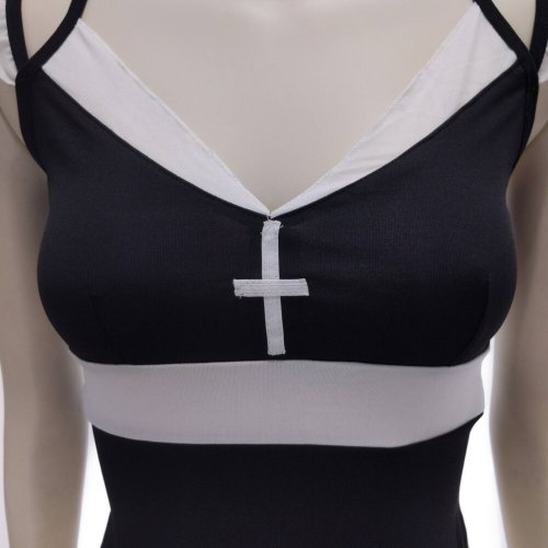 白のフリルがポイントのシスター風セクシーコスプレ(SEXYCOSPLAY)。黒を基調としたミドル丈ワンピースのシスター風のコスチューム。さらっと着心地のよいワンピースには肩紐にフリルをあしらってかわいらしくアレンジ。同じくTバックショーツにもフリルが施してあります。肩紐はアジャスター付きでサイズ調整可能。