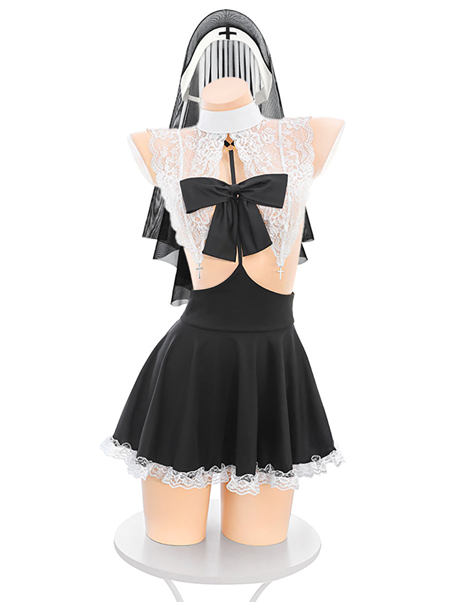 デザイン: この セクシーな修道女の服装のコスプレランジェリーはセクシーなホルターネックスタイルのミニドレス、オープンボディスデザイン、ドラマチックな特大の黒いリボン、白いレースの襟が特徴です。この衣装は、伝統的なテーマを魅惑的なひねりで再定義し、付属のフレアミニスカートは繊細なレースでトリミングされ、 お揃いの修道女の服装のベールが付いています。 コスプレや友人とのロールプレイングを楽しむ夜に最適です。