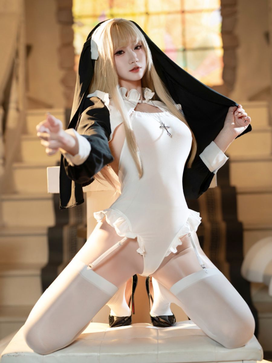 デザイン:このゴシック修道女ランジェリーコスチュームは、フリルのディテールが施された白いワンピースボディスーツ、機能的で遊び心のある着用のためのフックとアイのオープンクロッチ、ユニークな取り外し可能な長袖シュラッグが特徴です。外観を完成させるのは、テーマのあるコスプレに大胆なひねりを加えた、マッチした黒い修道女ベールです。