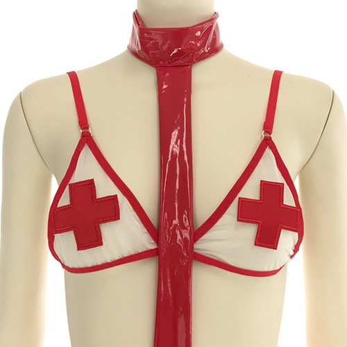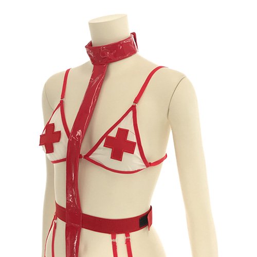 ボンテージ風が色気溢れ出る露出系ナース風セクシーコスプレ(SEXYCOSPLAY)。エナメル素材をチョーカーと一体型になったガーターランジェリーに使用。ショーツ部分としての役割も有り露出に磨きがかかった存在感抜群のアイテムです。拘束風のデザインでもあるのでハード過ぎないデザインは挑戦しやすいのもポイント♪ガーターベルトは大きな十字架のモチーフを仕立て裏側にベルトがついており、お好みのストッキングがずれにくくなるのもgood♪付属の大きなヘアリボンはハードさの中にキュートさも演出しやりすぎないバランスの取れたデザインです。