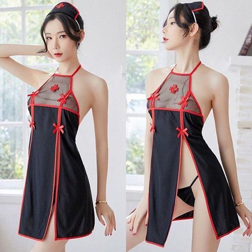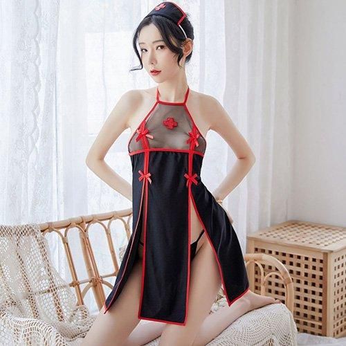 ひらひらスリットがセクシーなナース風コスプレ(COSPLAY)。サラリと滑らかな生地に大きくカットされたスリットから曝け出される素肌が視線を集中させるナース風のセクシーコスプレです。バスト部分のメッシュ生地は透け感があり生地越しの素肌がフェロモンたっぷりに見せ、バックスタイルはヒップラインを見せつける仕立てに興奮度を高めます。ワンピースはストリングで結ぶ仕様でサイズを気にせずご着用頂けます。