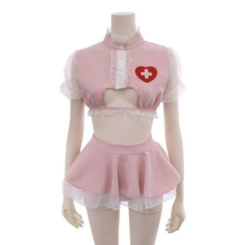シフォン袖とフリルがポイントのキュートなナース風コスプレ(COSPLAY)。随所にフリルチュールをあしらい、花の形のボタン、さらにクロスマークもキラキラにし細部に拘りカワイイをいっぱい詰め込みました。シフォン生地をあしらったふんわり超ミニスカートはヒップラインが露になるほどの丈感が誘惑的♪スカートウエストは着脱が容易なマジックテープでお好みのサイズに調整可能。絶妙にバストラインが露出するトップスのカットはアンダー部分にゴムが入ることで着苦しさを軽減してくれます。