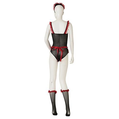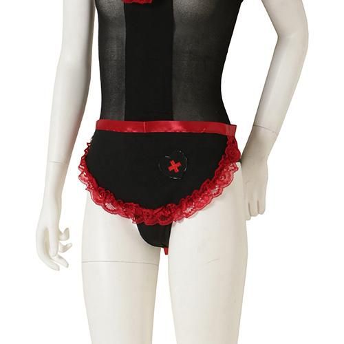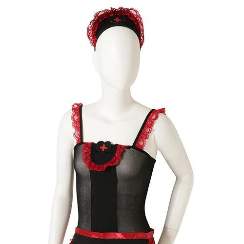 シースルー感がフェロモンを発するブラックナース風コスプレ(COSPLAY)。ストッキング生地をベースに異種素材を掛け合わせたブラックナース風のアイテムです。露出した素肌と生地越しの素肌はフェチズムを刺激し、ボディラインが曝け出され視覚的に堪能出来るアイテムです。差し色のレッドがより色っぽさを高めます。エプロンやカチューシャ、ストッキングを合わせれば足先まで完璧にコーディネートを楽しめます。クロッチにスナップボタンをあしらい着脱をスムーズにサポート♪