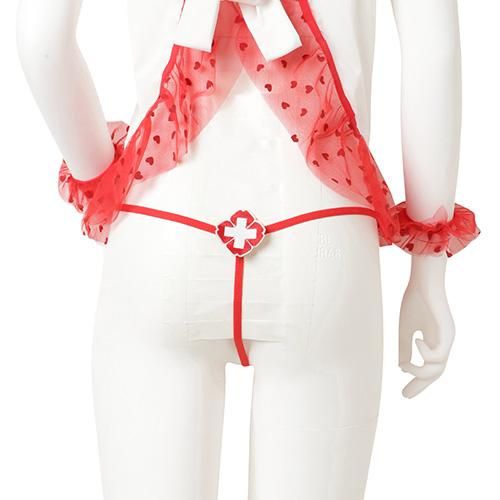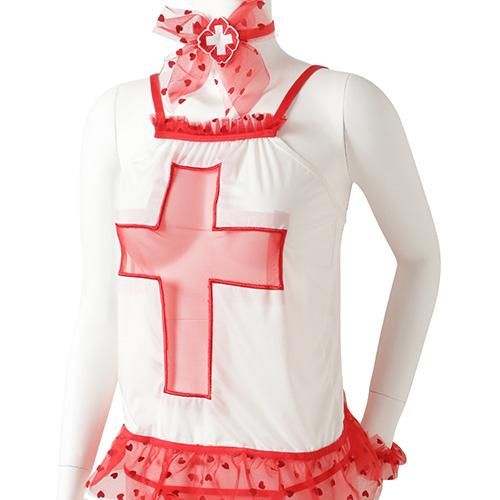 着丈の短さから見せるヒップ周りとふわふわチュールが色気とのギャップを演出するナース風コスプレ(COSPLAY)。肌触りの良い光沢のあるホワイトの生地にレッドのチュール生地を掛け合わせた裸エプロン風のナース風セクシーコスプレです。チュール生地にはハートデザインをあしらいキュートさをプラスし、フロント部分にはナースを連想させる十字架を仕立て生地越しにバストラインが露になり透け感を楽しめます。バックスタイルはヒップラインが露出されるほどの短さに見ている方も着ている方もドキドキ感が楽しめて気分も上がること間違いなし♪