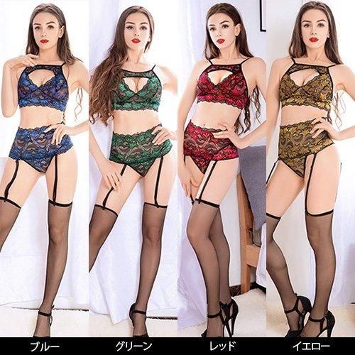 | セット内容 | ブラ、Tバックショーツ、ガーターベルト、ニーハイストッキング 4点 |