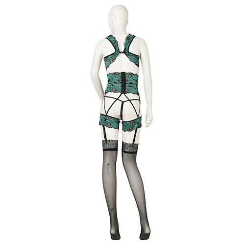 深みのあるカラーの総レース仕立てでエレガントさを演出するガーターランジェリー(GARTER LINGERIE)。ボタニカル柄レースのわずかな透け感からも色気を発するランジェリー。オリエンタルな香り漂うレースは素肌に映え、ボディを妖艶に飾ります。巧みなストリング使いでバストラインも美しく魅せ、ブラにはしっかりワイヤーが組み込まれバストを綺麗に保てます。ブラホックは2個留め3段階調節が可能。孔雀の羽を思わせるゴージャスな刺繍があしらわれたニーハイストッキングが付属。