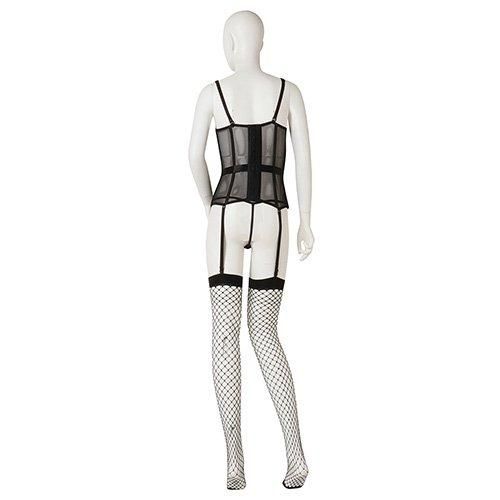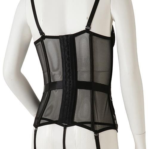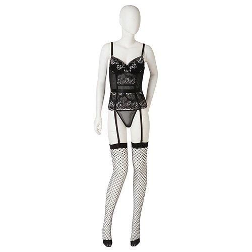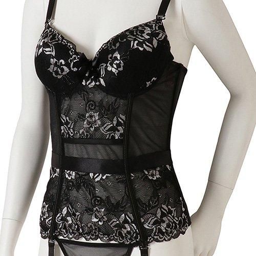 ブラックに映えるフラワー刺繍レースが妖艶な女性を演出するコルセットタイプガーターランジェリー(GARTER LINGERIE)。伸縮性のあるストレッチメッシュ生地はボディラインにピタッとしたシルエットを作り、カップにはワイヤーを入れ下の方に厚みを持たせたパッドでバストをグッと持ち上げ美胸をキープし、ウエスト部分にもボーンが入りしっかりボディメイクが出来る優れもの。ウエストの太めのテープが視覚効果でよりスッキリとした印象を与えます。美しいフラワー刺繍レースが大人な女性を演出し、色気溢れるコルセットタイプのガーターランジェリーです。背中のホックは15段3列でお好みのサイズ感を調節が可能、肩紐とガーターベルトは取り外しが可能。セットの網ニーハイを合わせればより魅力を引き出します。