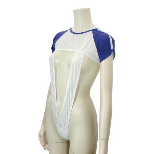 危なっかしくて無防備なVカットハイレグロングショーツの体操着風テディ(TEDDY)。脚の付け根からヒップにかけてのラインが大胆に露出したVカットハイレグロングショーツに、白×ネイビーの青春カラーマイクロショートトップスのバランスが刺激的なデザイン。ショーツはボディーパーツが隠したくても隠しきれないギリギリアウトなハラハラ感と、体操着風のトップスは汗がにじみ素肌がさらに透けてしまいそうなワクワク感。また、ストリングのバックスタイルはリボンを解くと全てが露出してしまう無防備で、非日常的なシチュエーションの誘惑がたくさん詰まったセクシーテディです♪