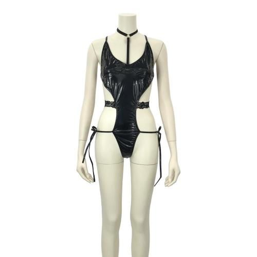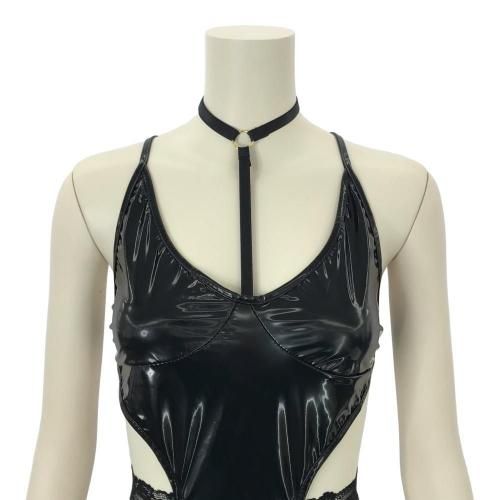 大胆なカッティングで挑発的なシルエットを魅せつけるエナメルテディ(TEDDY)。フェイクレザーの光沢感に大胆なカッティング、ボディラインを際立たせた挑発的なデザインのテディ。胸元は深いVネックに、首元からバストに向けてハーネスのようなストリングが肌を強調しハードで支配的な魅力を放つ。フェミニンな繊細レースがウエストを細見えし、ボトムス部分はリボンで調整が可能なドロストタイプ。リボンを解くとより肌が露わになってしまうギミックがその魅力をより一層高めます。